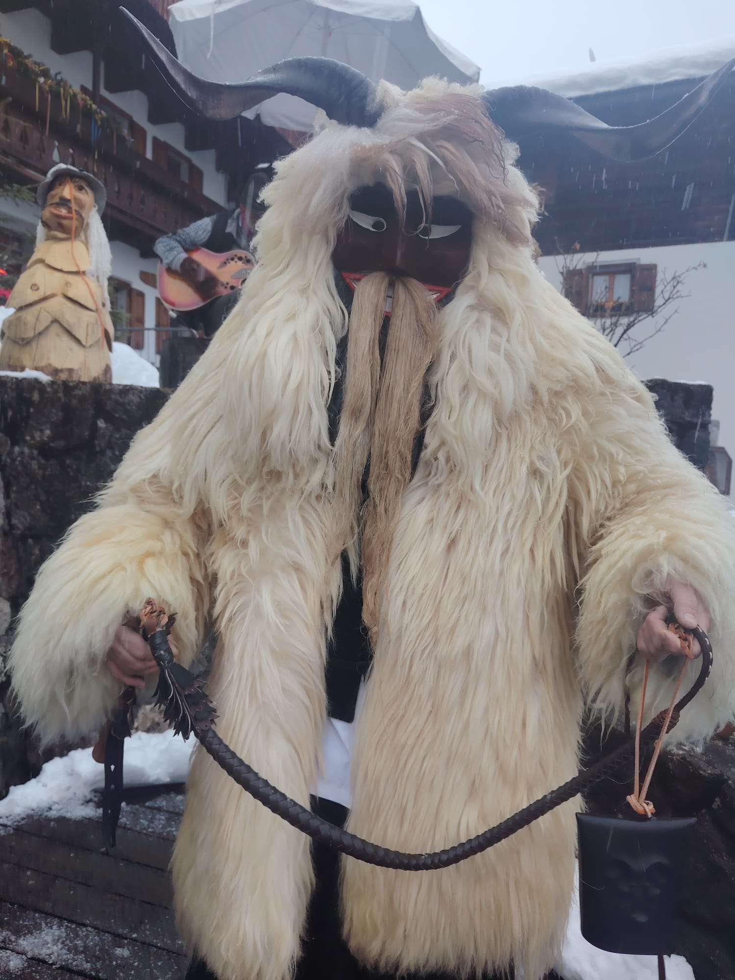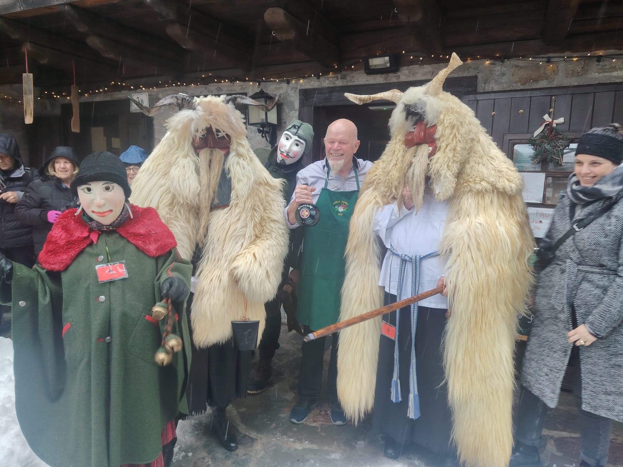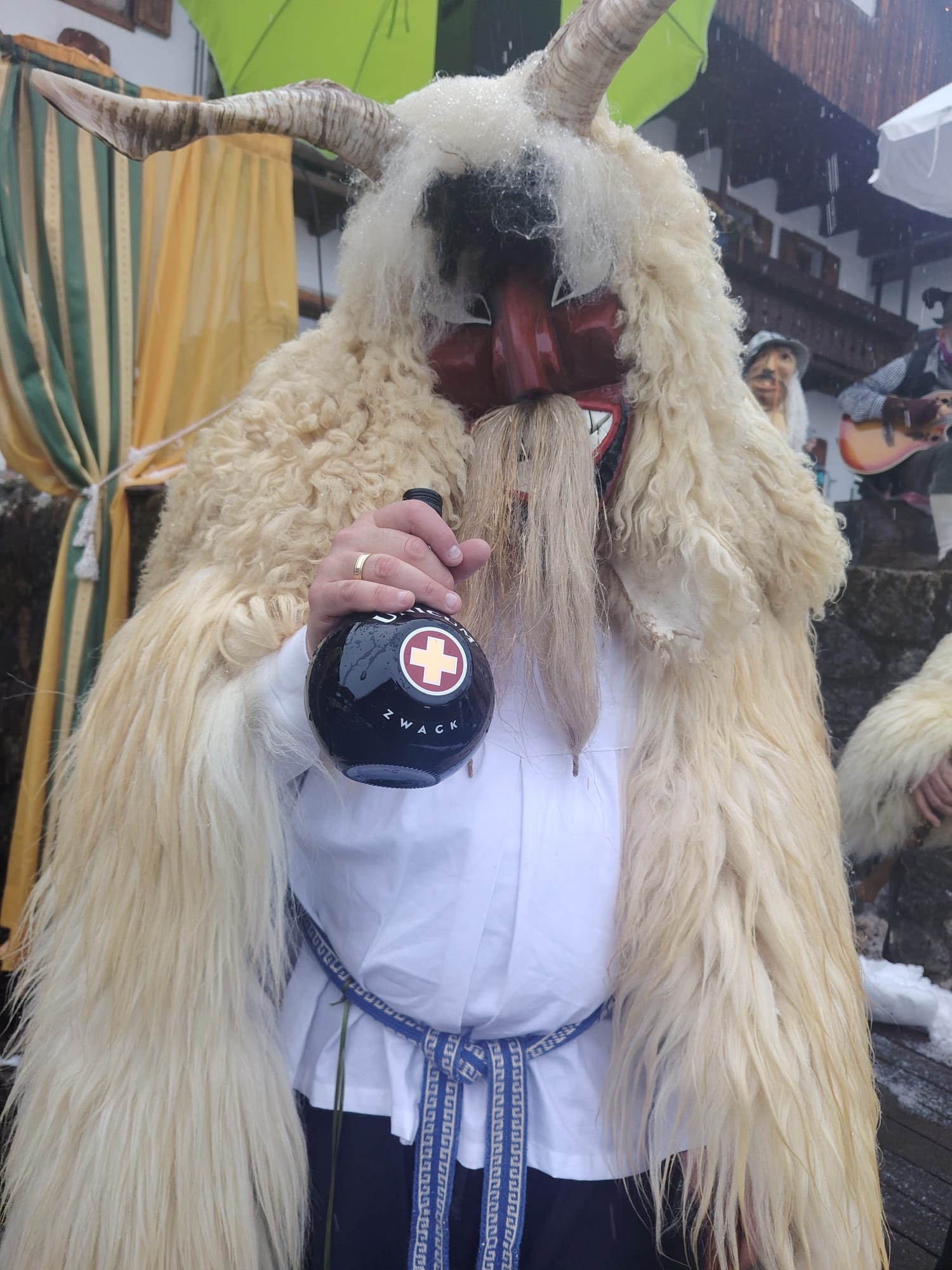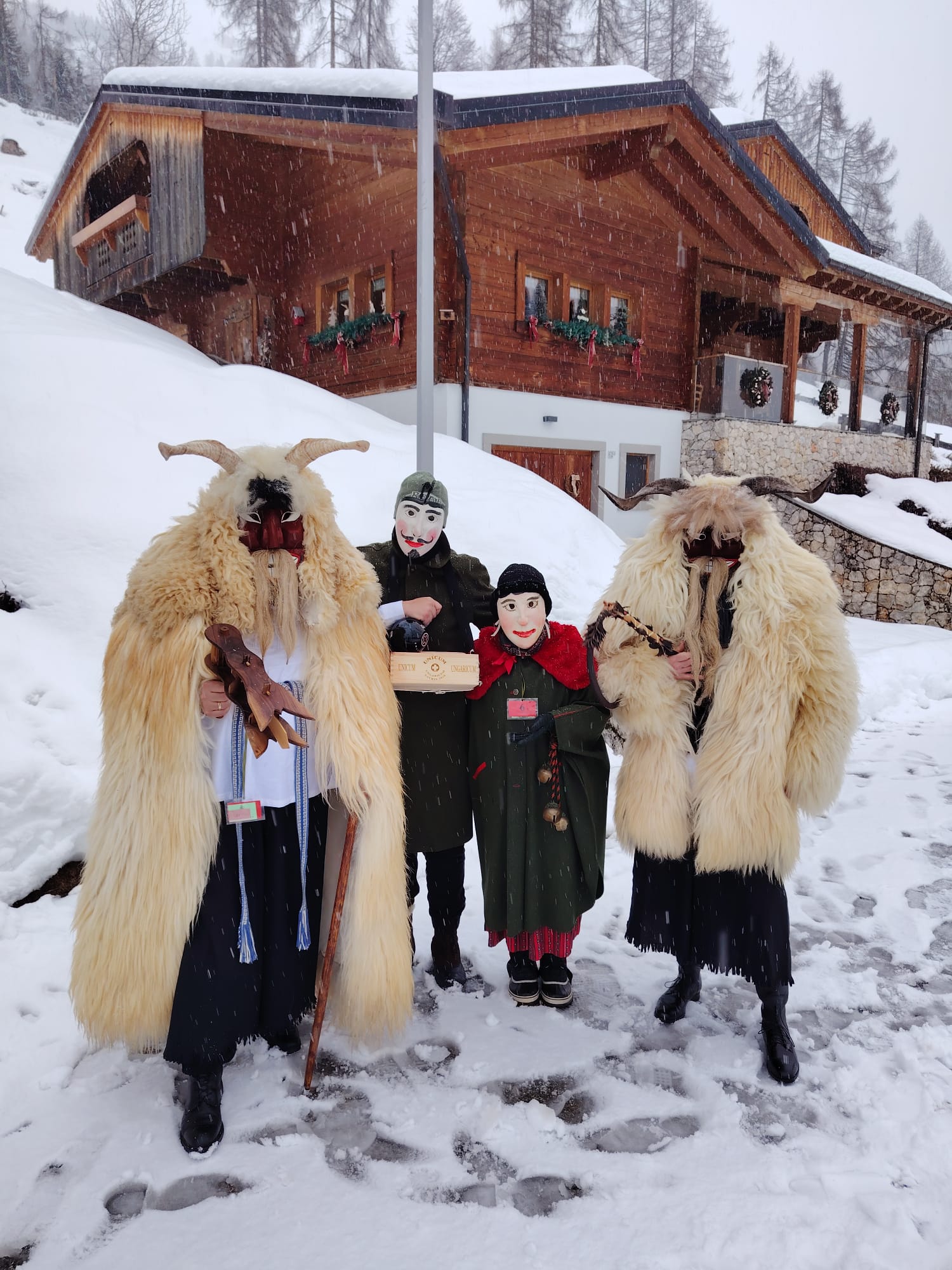Tra gli ospiti più originali dell’edizione 2026 il gruppo Unicum Ungaricum, formato da corregionali residenti in Ungheria, che ha portato sulle Dolomiti lo spirito del Busójárás di Mohács, riconosciuto dall’UNESCO come patrimonio culturale immateriale. Come ci racconta Flavio Aita, corregionale residente a Budapest, le maschere Busó, scolpite a mano, con corna imponenti e pelli di pecora, hanno sfilato tra la neve accompagnate dal suono della karikás ostor, la tradizionale frusta dei mandriani a cavallo della grande steppa ungherese. Con i suoi schiocchi improvvisi, utilizzati in modo giocoso per sorprendere i presenti, la frusta ha amplificato l’impatto scenico e sonoro del corteo, rievocando l’antico rito simbolico della cacciata dell’inverno.