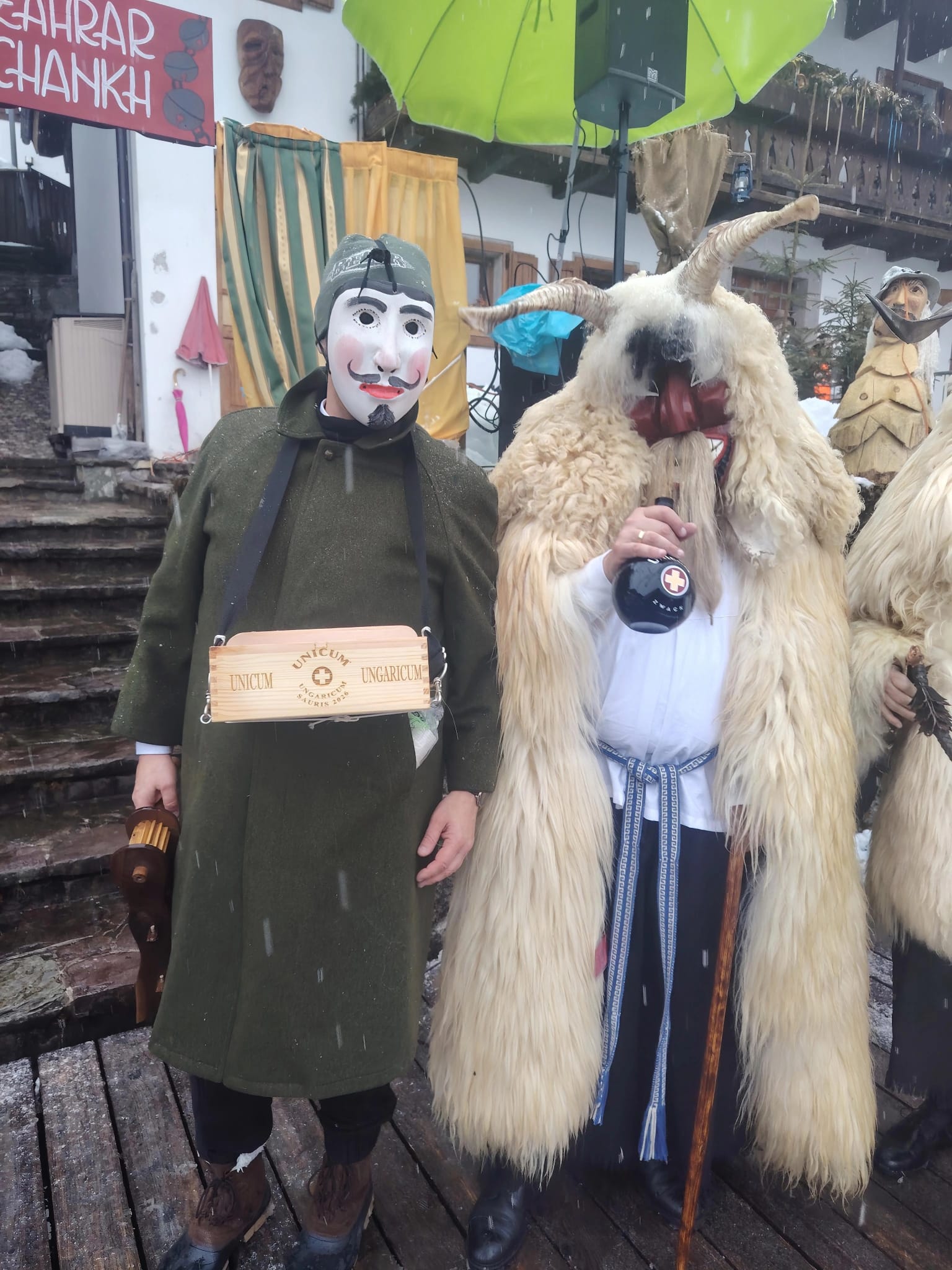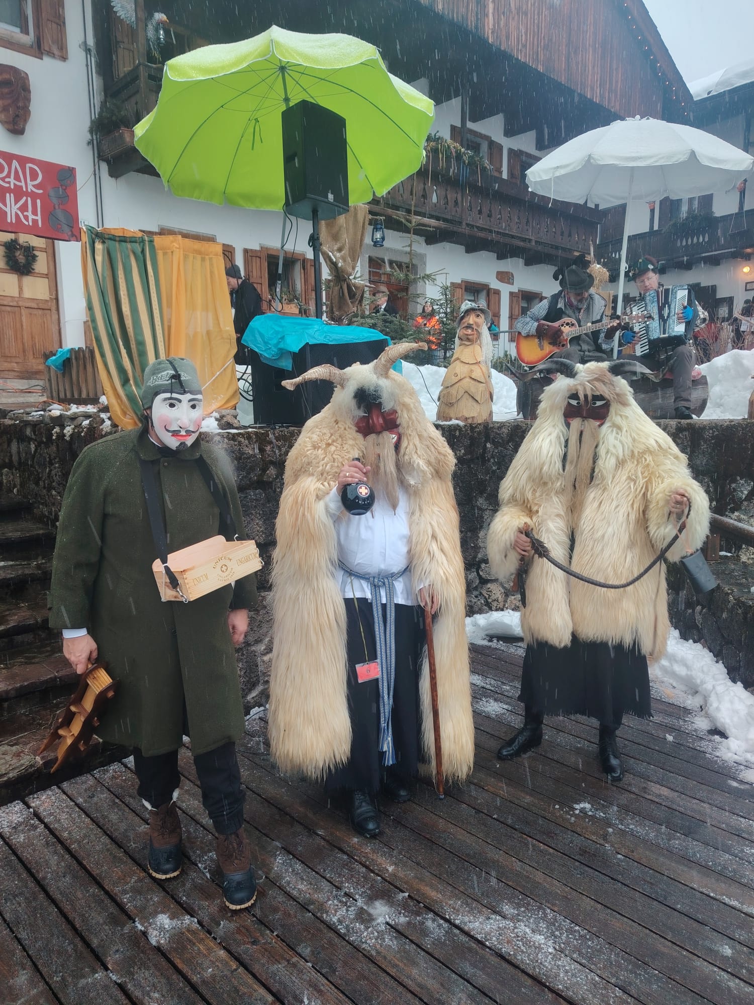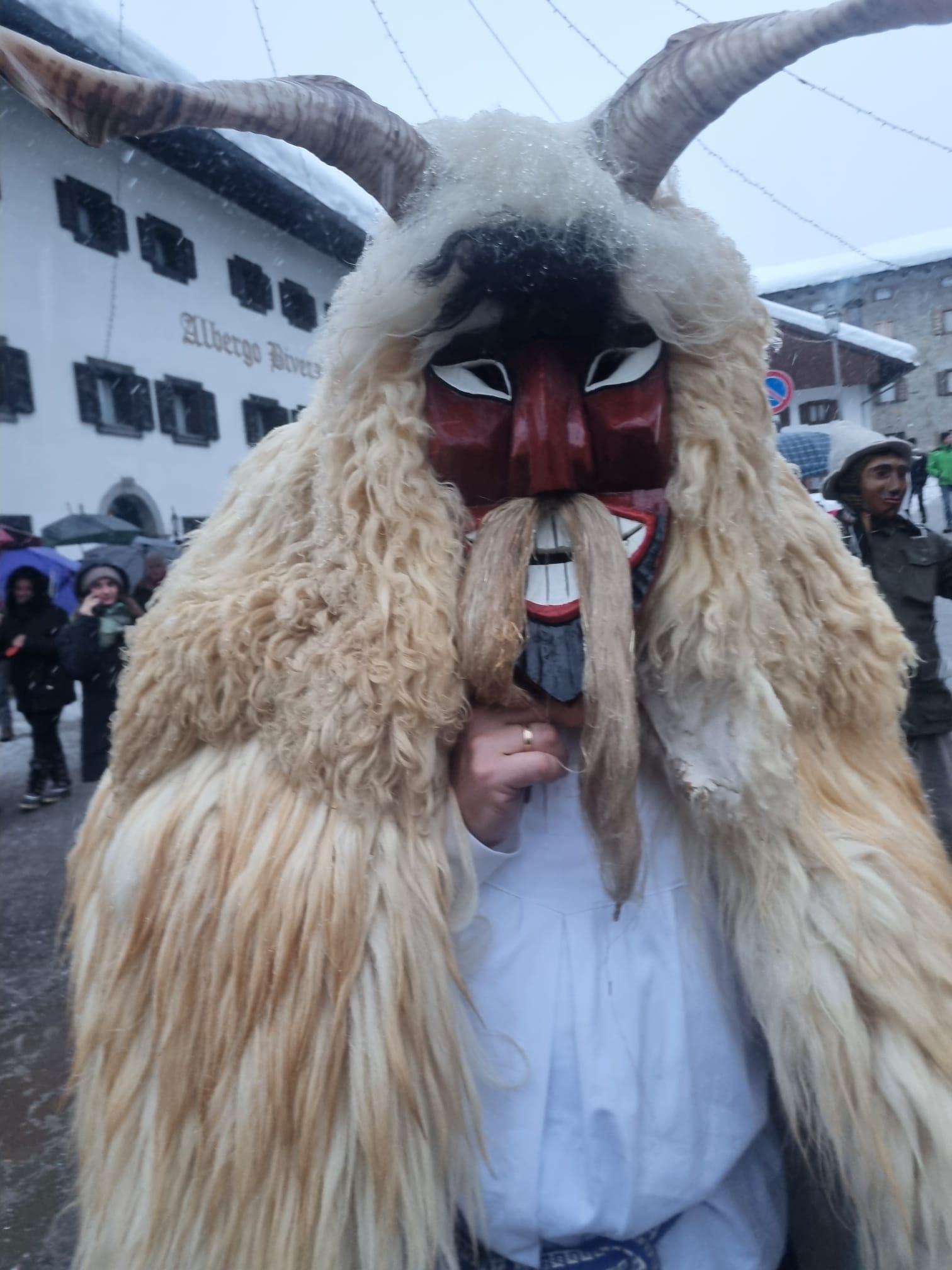 Tra gli ospiti più originali dell’edizione 2026 il gruppo Unicum Ungaricum, formato da corregionali residenti in Ungheria, che ha portato sulle Dolomiti lo spirito del Busójárás di Mohács, riconosciuto dall’UNESCO come patrimonio culturale immateriale. Come ci racconta Flavio Aita, corregionale residente a Budapest, le maschere Busó, scolpite a mano, con corna imponenti e pelli di pecora, hanno sfilato tra la neve accompagnate dal suono della karikás ostor, la tradizionale frusta dei mandriani a cavallo della grande steppa ungherese. Con i suoi schiocchi improvvisi, utilizzati in modo giocoso per sorprendere i presenti, la frusta ha amplificato l’impatto scenico e sonoro del corteo, rievocando l’antico rito simbolico della cacciata dell’inverno.