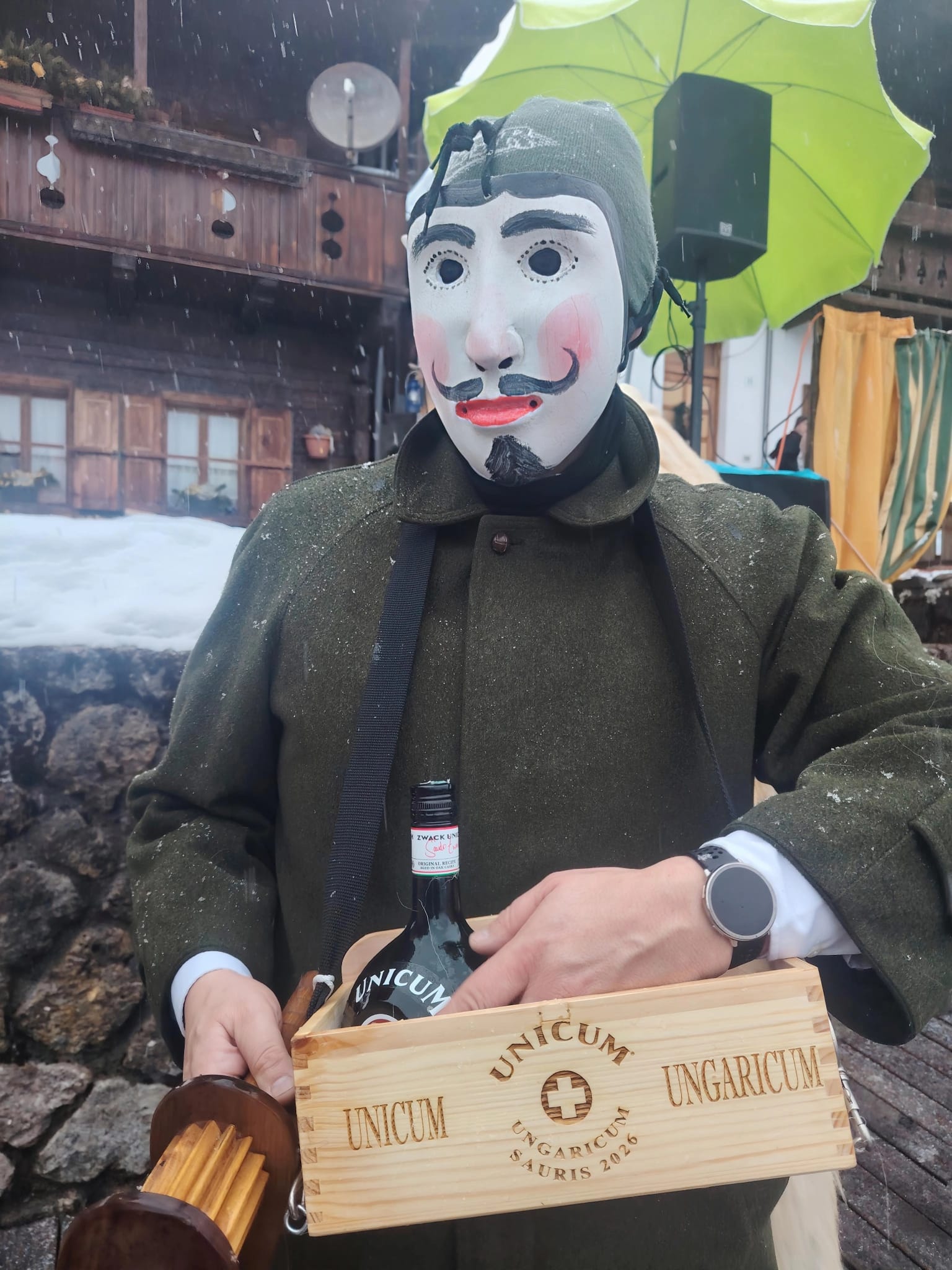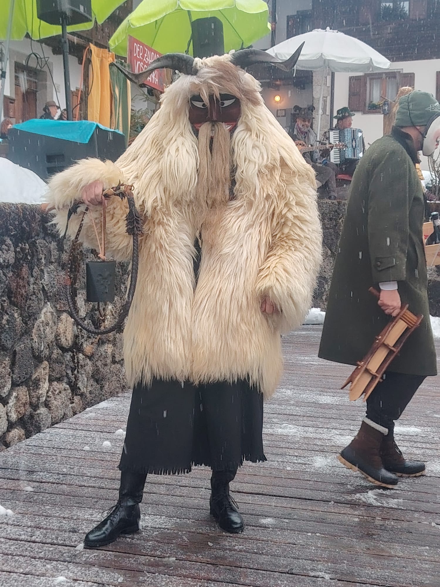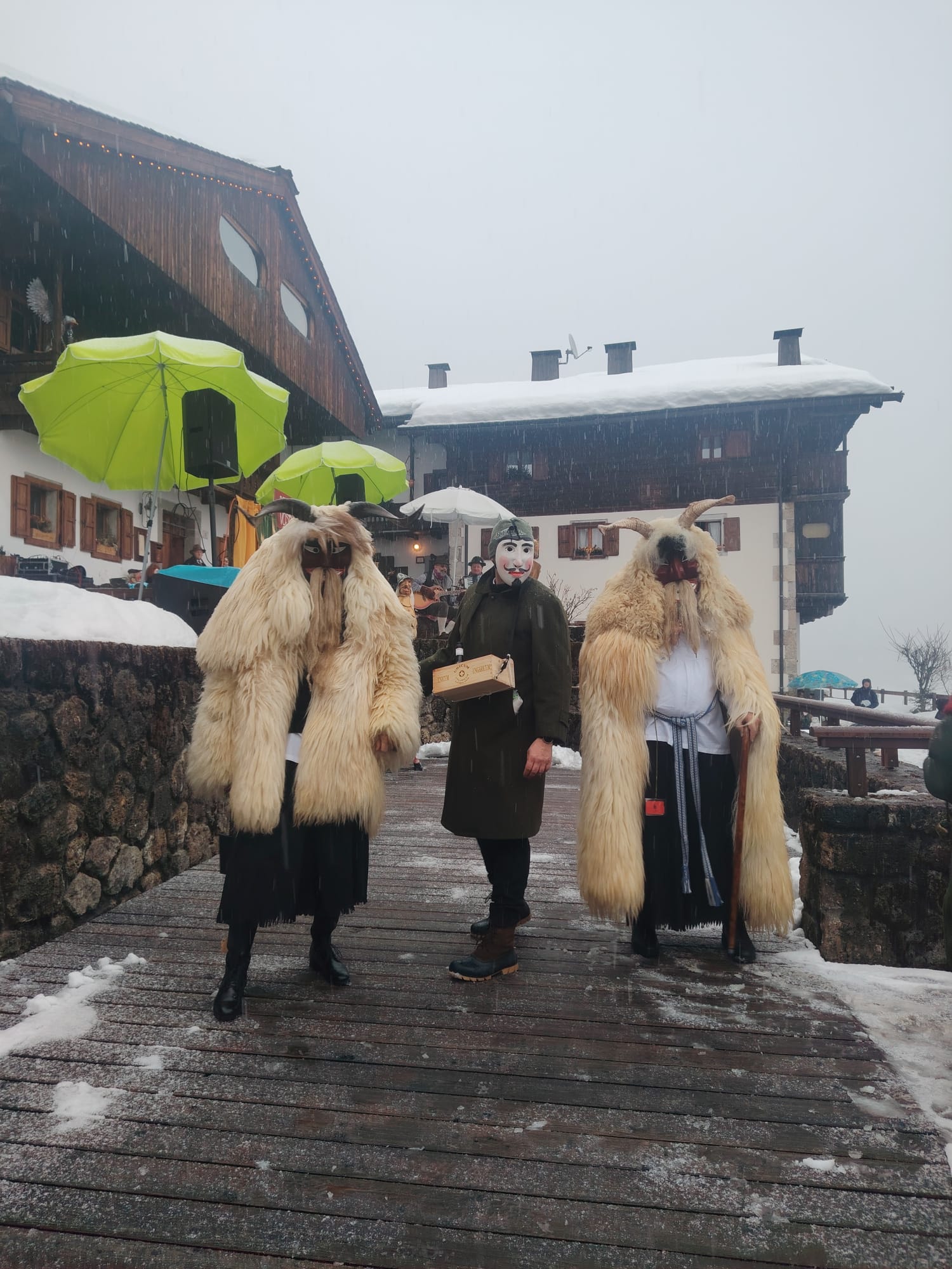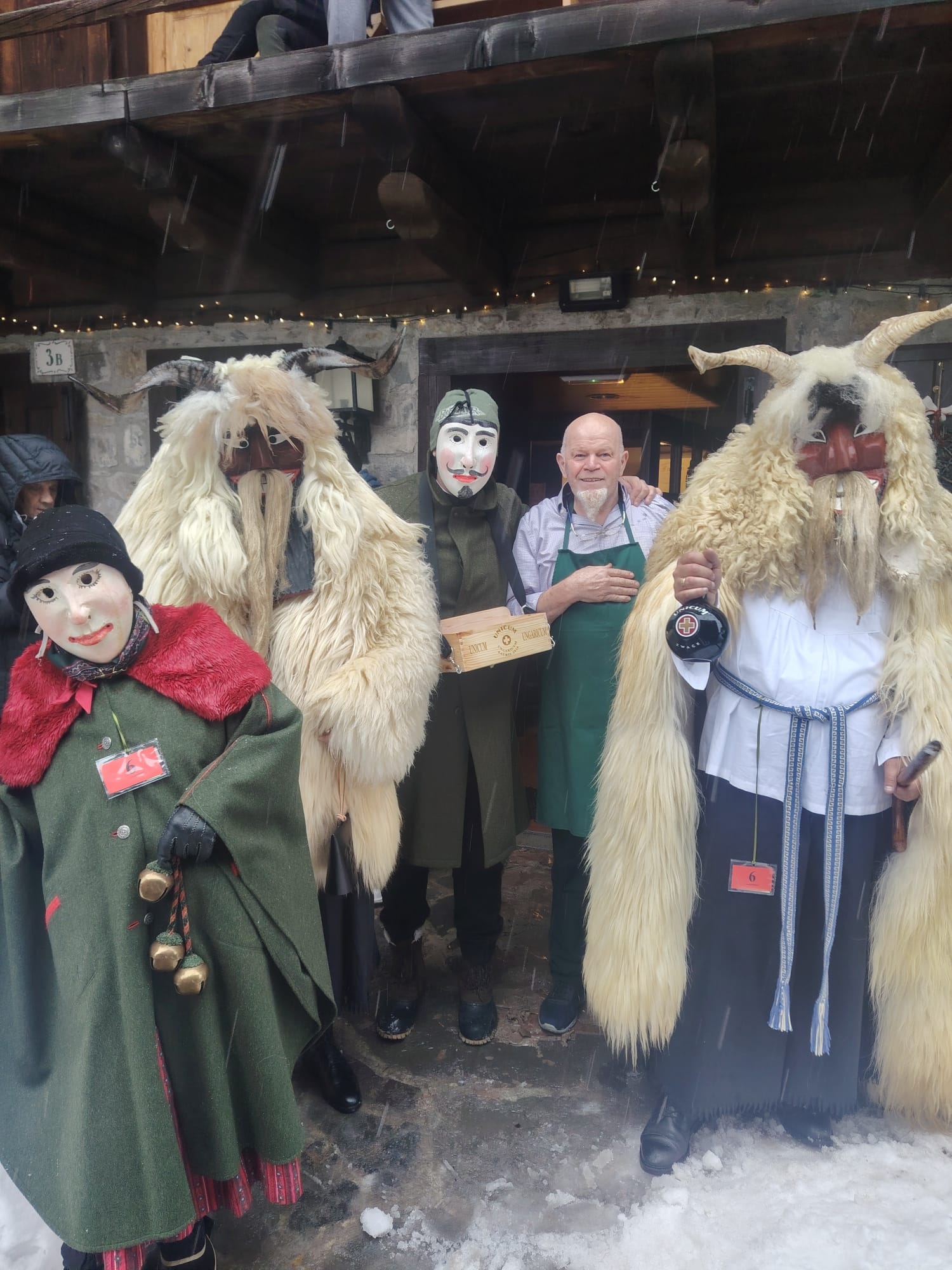 Tra gli ospiti più originali dell’edizione 2026 il gruppo Unicum Ungaricum, formato da corregionali residenti in Ungheria, che ha portato sulle Dolomiti lo spirito del Busójárás di Mohács, riconosciuto dall’UNESCO come patrimonio culturale immateriale. Come ci racconta Flavio Aita, corregionale residente a Budapest, le maschere Busó, scolpite a mano, con corna imponenti e pelli di pecora, hanno sfilato tra la neve accompagnate dal suono della karikás ostor, la tradizionale frusta dei mandriani a cavallo della grande steppa ungherese. Con i suoi schiocchi improvvisi, utilizzati in modo giocoso per sorprendere i presenti, la frusta ha amplificato l’impatto scenico e sonoro del corteo, rievocando l’antico rito simbolico della cacciata dell’inverno.